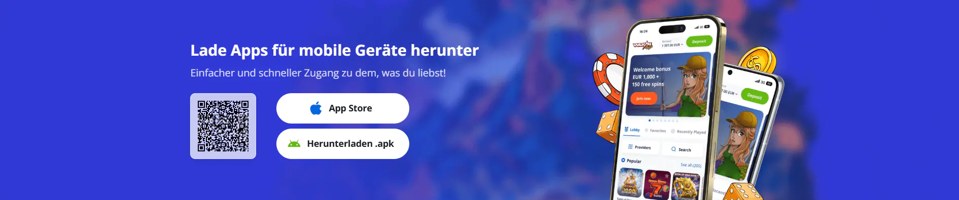 Neben der Desktop-Version bieten wir mit der VulkanVegas App eine vollwertige mobile Alternative für Android und iOS. Die App enthält denselben Funktionsumfang wie die Browser-Version: Spiele, Zahlungen, Support und Kontoverwaltung sind jederzeit verfügbar. Zusätzlich profitieren Spieler in der App von exklusiven Aktionen, speziellen Vulkan Vegas Bonis und Features wie Push-Benachrichtigungen oder dem beliebten Shake-Bonus. Die Installation erfolgt einfach über die offizielle Seite oder per QR-Code. Damit bleibt Vulkan Vegas deutsch auch unterwegs komfortabel, sicher und leistungsstark – perfekt für alle, die flexibel spielen möchten.